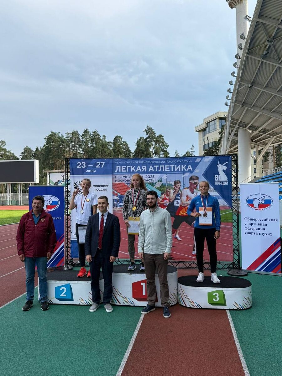Отличные новости из Жуковского На стадионе «Метеор» в Жуковском проходят чемпионат и юниорское первенство России по спорту глухих (легкая атлетика). В первый день соревнований копилка ставропольской сборной пополнилась двумя наградами. Алина Кржижановская (тренер — Татьяна Журавлёва) примчалась второй к финишу по итогам забега на 100 метров. Бронзу в толкании ядра завоевал Кирилл Цибизов (тренер — Сергей Халатян). Четверку лучших в беге на 100 метров замкнула Алиса Литвиновская (тренер — Татьяна Журавлёва), а Савелий Шалагин вошел в топ-9 на дистанции 400 метров. Также честь края в Подмосковье защищают Виктория Моисеева, Алина Милякова, Назли Ханум Атаева, Елизавета Матевосова, Саид Курбанов и Всеволод Кулаев.