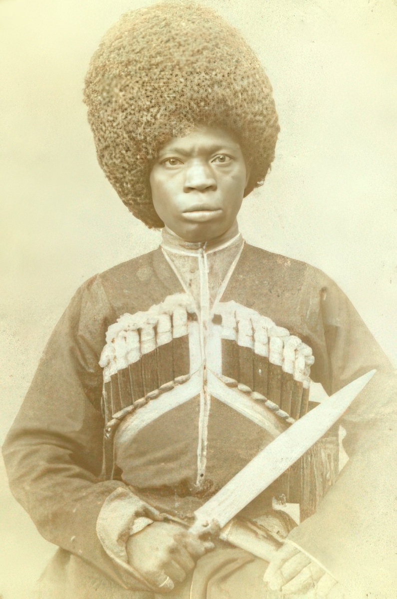 Афро-кавказец из XIX века. Доподлинно неизвестно, как темнокожие выходцы из Африки появились на Кавказе. Существует несколько версий. По одной из них, у берегов Абхазии затонуло работорговое судно. И спасшиеся рабы поселились в Абхазии. По другой — арапов, которые не привыкали к северному климату, отправлял на юг в подчинение абхазским князьям Петр I. А последующие военачальники по его примеру также нанимали на службу темнокожих. На фото 1880-х гг. показан карабахский афро-горец. Снимок сделал во время своей экспедиции на Кавказ путешественник и корреспондент агентства «Ассошиэйтед Пресс» (“Associated Press”) Джордж Кеннан. Мы восстановили портрет в нейросети.