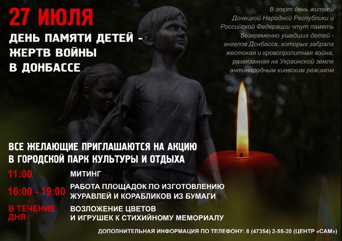 27 июля — день памяти детей-жертв войны в Донбассе. В рамках этой памятной даты в городском парке культуры и отдыха Борисоглебска пройдет тематическая акция. Подробности в афише мероприятия.