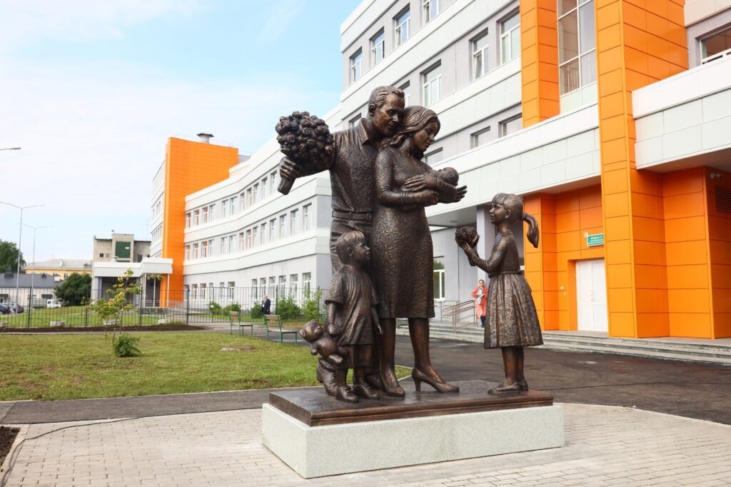 Перед роддомом Верхнепышминской центральной городской клинической больницы установили скульптуру «Счастливая семья». Она изображает супружескую пару с новорожденным ребенком и двумя подросшими детьми.