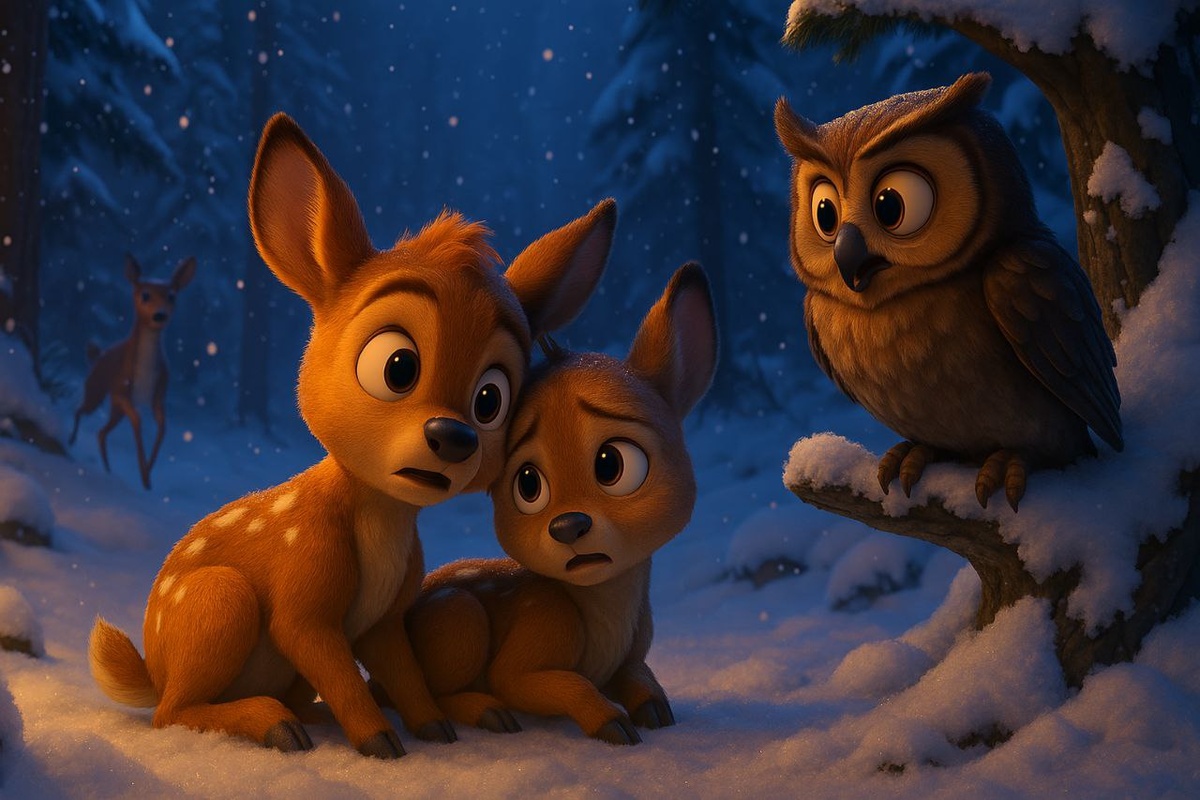 Сказка «Заблудившиеся оленята» В густом, заснеженном лесу, где сосны тянулись к небу, а снег искрился, будто рассыпанные алмазы, жила семья оленей. У мамы-оленихи было два оленёнка — Лучик и Росинка. Лучик был смелым и любопытным, а Росинка — осторожной и доброй. Однажды, когда мама ушла искать коренья, оленята решили поиграть в прятки. Лучик предложил забежать подальше, чтобы спрятаться лучше. Росинка колебалась, но брат уговорил её. Они бежали, смеялись, прыгали через сугробы, пока не поняли, что не помнят дорогу назад. Вокруг стояли незнакомые деревья, а с неба начал падать густой снег. Росинка испугалась: — Мы заблудились! Что же делать? — Ничего страшного, — сказал Лучик, но в голосе его уже дрожала неуверенность. Тем временем в лесу пробуждались сумерки. Вдалеке завыл ветер, а где-то хрустнула ветка. Оленята прижались друг к другу. Вдруг из-за дерева вышел старый мудрый Филин. — Ой-ой-ой, кто это дрожит под моим дуплом? — спросил он. — Мы потерялись, — прошептала Росинка. — Г