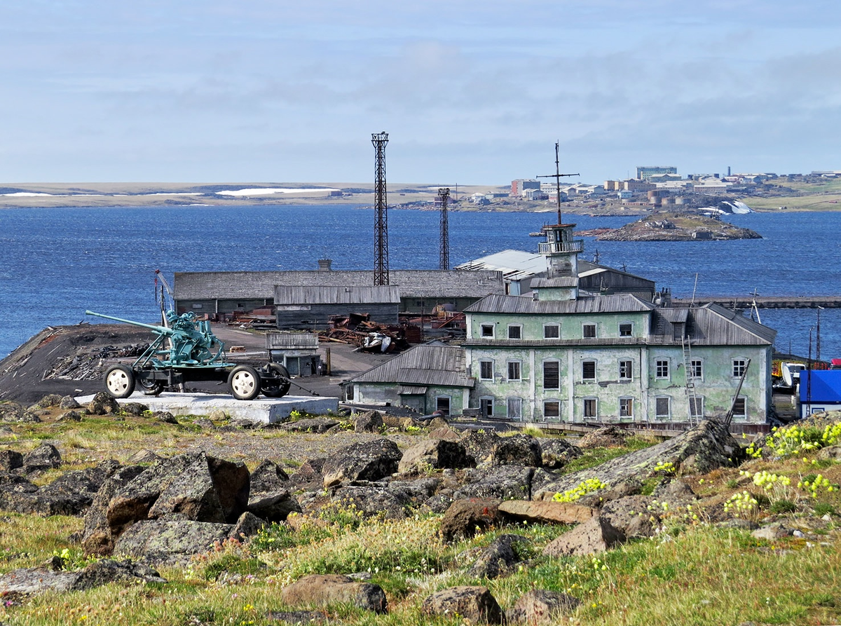 Принято говорить не «в Диксоне», а «на Диксоне» - потому что начиналось всё на острове Диксон. Теперь он необитаем, и лишь благодаря аэропорту и метеостанции – не забыт. Окончательно расселённый в конце 2000-х, остров висит задним планом за проливом Вега, а посёлок, где живут последние три сотни диксончан – на материке.