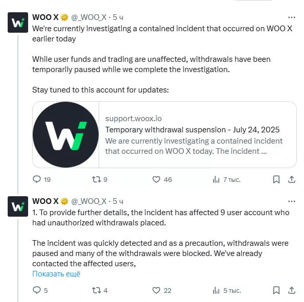 🔸Биржа WOO X приостанавила вывод средств после потери $14 млн из-за инцидента с безопасностью, затронувшего 9 пользовательских аккаунтов