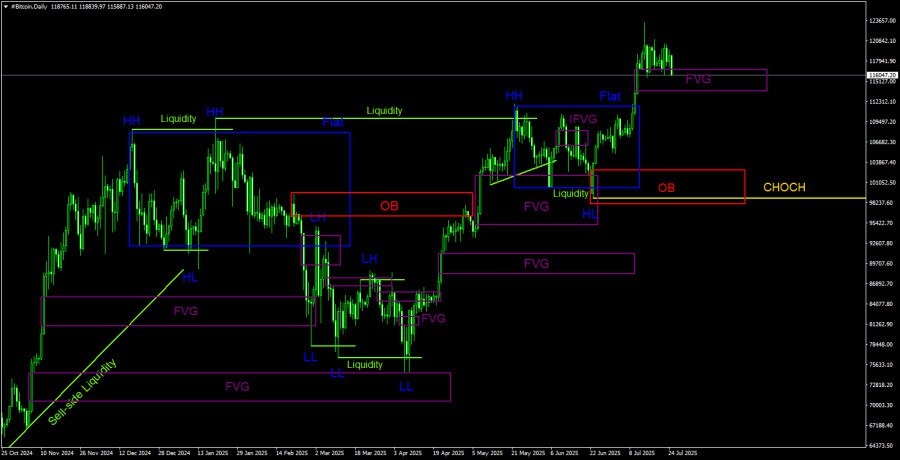 https://basechop.ru/wordpress/?p=50961 Биткоин сформировал очередной флэт на максимумах, чем он грешит в последнее время довольно часто. Коррекции биткоина мы по-прежнему наблюдаем крайне редко. Институциональные участники рынка продолжают скупать биткоин практически по любым ценам, что и обеспечивает рост первой криптовалюте. Сегодня ночью началось довольно сильное падение биткоина, но оно не должно вводить в заблуждение – цена все также располагается внутри локального флэта на 4-часовом ТФ. Таким образом, совершенно не исключено формирование девиации на покупку около нижней линии бокового канала с последующим ростом или даже возобновлением восходящего тренда. Также чуть ниже «бычьего» FVG располагается область FVG. Таким образом, возможна отработка этого FVG плюс девиация и дальше – новый рост. Если котировки биткоина покинут боковой канал и проигнорируют «бычий» FVG, это будет серьезным сигналом к развороту на коррекцию. Напомним, что эфир, который в последнее время показал рост д