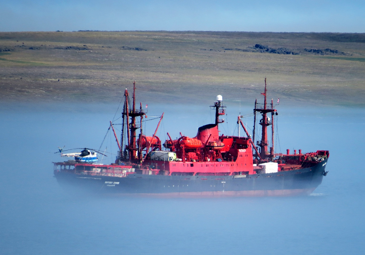 У моего вынужденно затянувшегося пребывания на Диксоне («Красавиа» просто отменила мой рейс 18 июля, пересадив на 22-е) было и кое-что положительное: ведь 19 числа сюда прибывал «Академик Сомов». В определённых кругах это легендарное судно – транспорт Росгидромета, выходя три раза в год из Архангельска, он проходит тремя рейсами всю Арктику, снабжая труднодоступные метеостанции на Краю Земли. А на метеостанции я и поселился, перебравшись с материкового Посёлка на почти не обитаемый Остров. К прибытию «Сомова» метеостанция готовилась – не столько даже практически, сколько морально: по сути это для неё главный день года. 19-е выдалось самым мрачным днём всех моих полутора недель на Диксоне: +3 градуса, невыносимая мозгля, ночной дождь, густой туман и пронзительный ветер. Ноябрь как он есть – в середине лета! Ближе к полудню из тумана то и дело начал проступать силуэт судна, а ещё пару часов спустя туман расступился достаточно, чтобы видеть его отчётливо. Приблизив «Сомова» в ультразум,