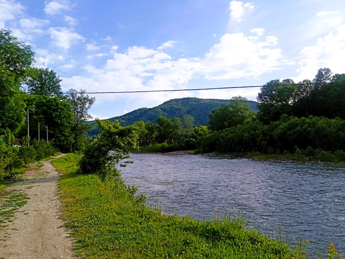 Река Белая — главная река Адыгеи, берёт начало возле гор Фишт и Оштен и впадает в Краснодарское водохранилище. В верхнем течении это типичная горная река, в нижней части она превращается в равнинную. В солнечную погоду вода в реке может быть бирюзовой, а в пасмурную — цвета зелёного бутылочного стекла. Тут через реку переброшен подвесной мост. Мост довольно сильно качается, когда на него заходят люди, поэтому я лично на него не пошел, со своими 140 кг. Людей ходят много. Жена сбегала, сфоткала. Улучила момент без людей. Тут на берегу реки находится довольно симпатичная база отдыха Бэлла. Вот такие домики, видели бассейн там, с людьми. Места очень живописные! Река, обрыв! Горы на заднем плане. Очень приятно было погулять вечером у реки...