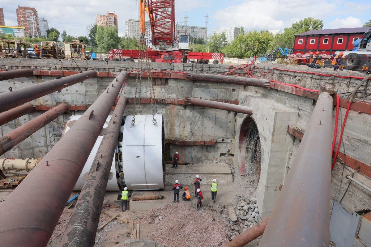 На станции «Высотная» начали сборку нового тоннелепроходческого щита весом 592 тонны и длиной свыше 80 метров. В монтажную камеру уже опустили технические платформы с пунктом управления, системы электроснабжения, оборудование для подачи блоков тоннельной обделки, вывоза грунта и другие механизмы.