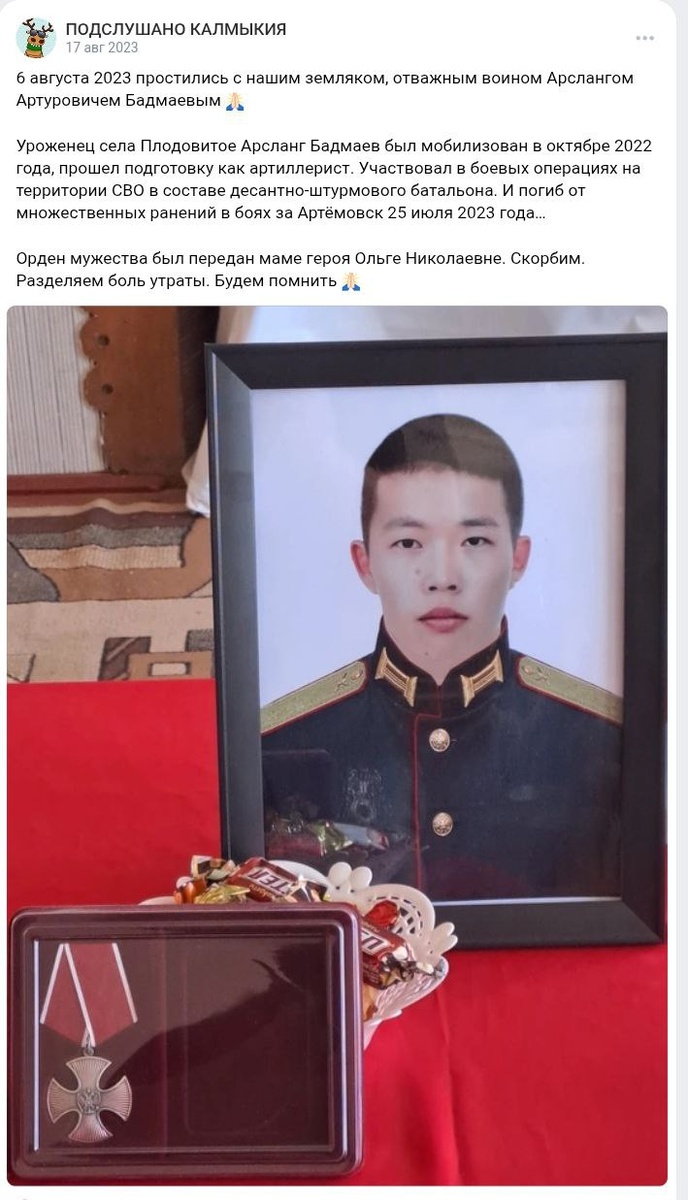 Два год на назад 25 июля 2023 года ушёл в БЕССМЕРТНУЮ ВЕЧНОСТЬ ОЙРАТ-КАЛМЫЦКИЙ МУЖЧИНА БААТЫР, ВОИН, ЗАЩИТНИК ОТЕЧЕСТВА, кавалер Ордена Мужества (посмертно) АРСЛАНГ АРТУРОВИЧ БАДМАЕВ 🙏🙏🙏, уроженец Малодербетовского района Калмыкии. Вечные СЛАВА, ПАМЯТЬ и БЛАГОДАРНОСТЬ ГЕРОЮ🙏🙏🙏. Маме ГЕРОЯ Ольге Николаевне - всех всех всех благ 🙏🙏🙏! #память #санл #точтонасобъединяет #ЗащитникиОтечества #Герои #хальмгбаатрмуд #ЛюдиКалмыкии #АрслангБадмаев