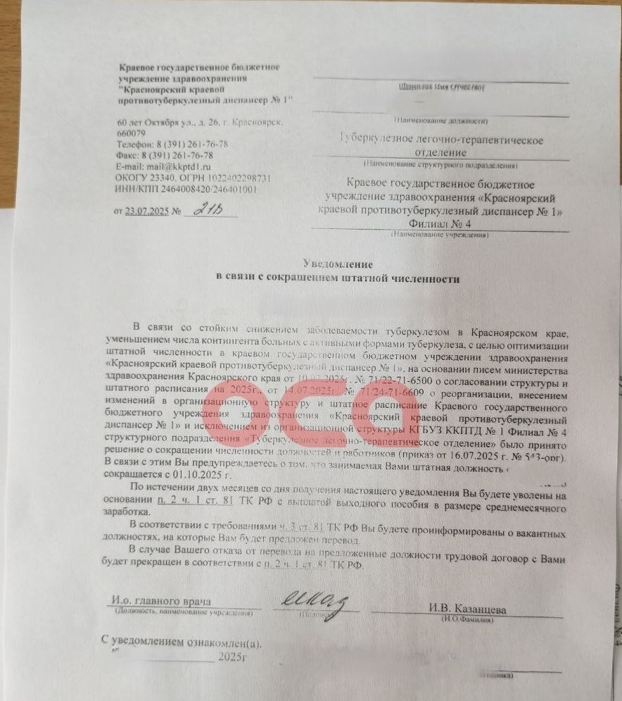 В Ачинске Красноярского края закрывается противотуберкулёзный стационар. Ачинская телекомпания ОСА опубликовала аудиозапись совещания, на котором работникам учреждения объявили о сокращении. Замглавного врача Светлана Назмутдинова назвала это реорганизацией всей противотуберкулёзной службы, она также сообщила, что стационары закроют ещё в четырёх территориях. Приказ был подписан министром здравоохранения и согласован с краевым правительством, сказала замглавного врача. Сами работники узнали об этом внезапно, на закрытие отвели всего 10 дней. Врачи выразили возмущение на что Светлана Назмутдинова ответила, что они могут жаловаться в любые инстанции. — Президенту больше делать нечего, как заниматься вашим обращением. Не тратьте свое время и наше, хотя всем ответим и напишем. Цитирует замглавного врача ОСА. Работникам предложили уйти по соглашению сторон, так как это наиболее выгодный вариант для обеих сторон. Сохранять противотуберкулёзный стационар считают нецелесообразным, так как есть