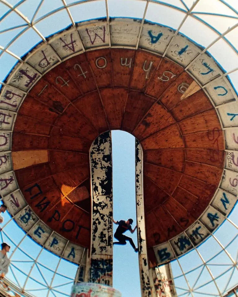 Первым пунктом стал Кишинёвский цирк — потрясающий образец советского модернизма в центре города. Мы думали, что он заброшен, и планировали забраться наверх, чтобы снять дроном проход по балкам на крыше. Однако, едва перелезли через ограждение, как нас встретила охранная собака и сотрудники, которые дали понять: объект всё ещё используется, несмотря на обшарпанный вид.