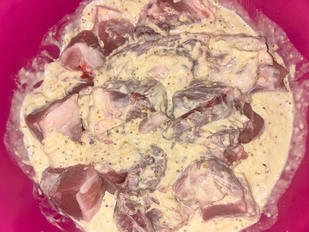 Увидев рецепт этого маринада, я загорелась попробовать. И вот, час настал - погода чудесная, мясо куплено (кострец в частном магазинчике), и я приступила к реализации! Не терпелось попробовать, ведь сочетание ингредиентов очень необычное. Обещают благородные фруктовые нотки, обогащающие вкус мяса. Предполагается использовать свинину или курицу, у меня - первая.