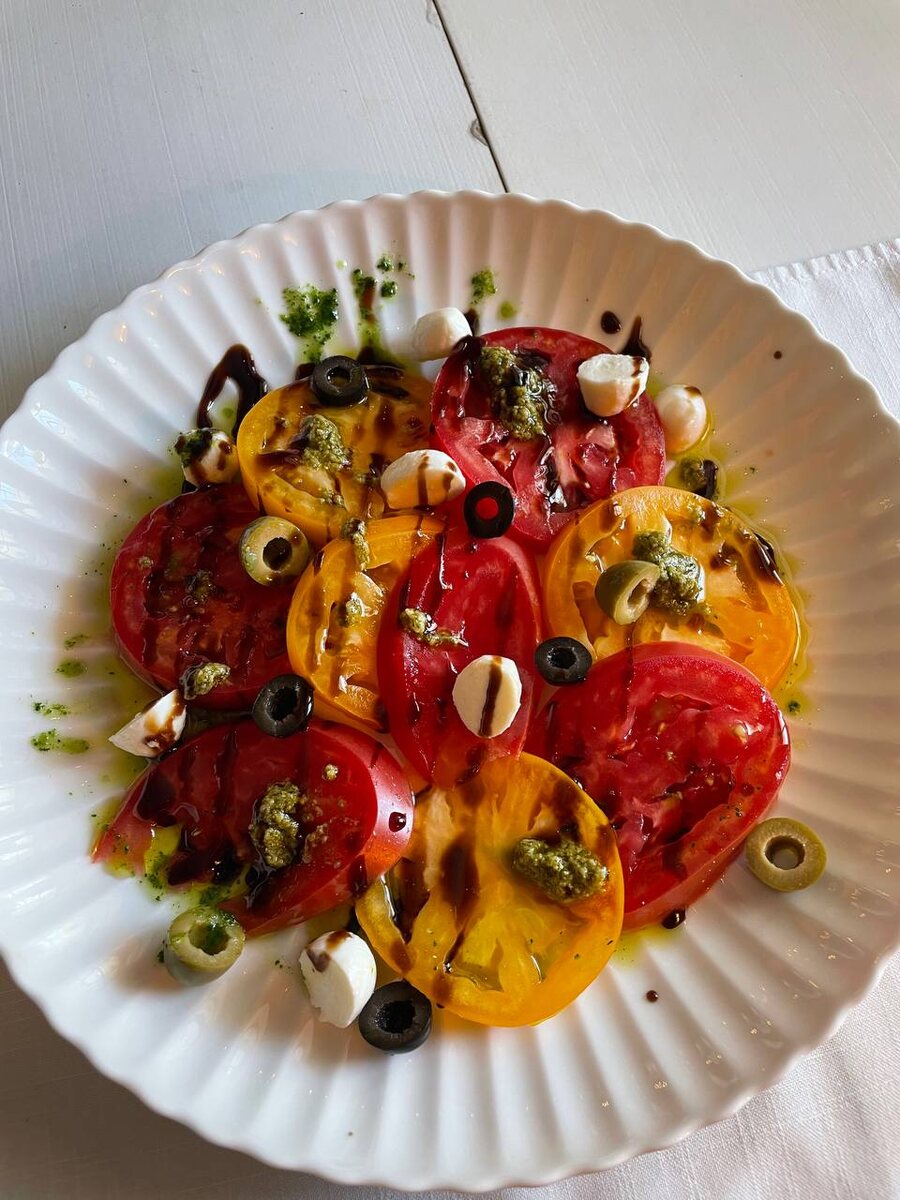 Салат из помидоров с соусом песто и масляной заправкой из трав ,сыр мацарелла