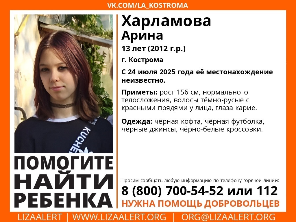 Харламова Арина ушла из дома 24 июля и до сих пор не вернулась В Костроме ищут девочку-подростка, которая ушла из дома и не вернулась. Последний раз 13-летнюю Арину Харламову видели 24 июля. С тех пор о ее местонахождении ничего неизвестно. Помощи в поисках девочки у неравнодушных просят добровольцы поисково-спасательного отряда «ЛизаАлерт». Особые приметы Арины: рост 156 сантиметров, нормальное телосложение, темно-русые с красными прядями у лица волосы, карие глаза. Была одета в черную кофту, черную футболку, черные джинсы и черно-белые кроссовки. Информацию о местонахождении подростка можно сообщить по бесплатному номеру горячей линии 8(800)700 54-52 или 112.