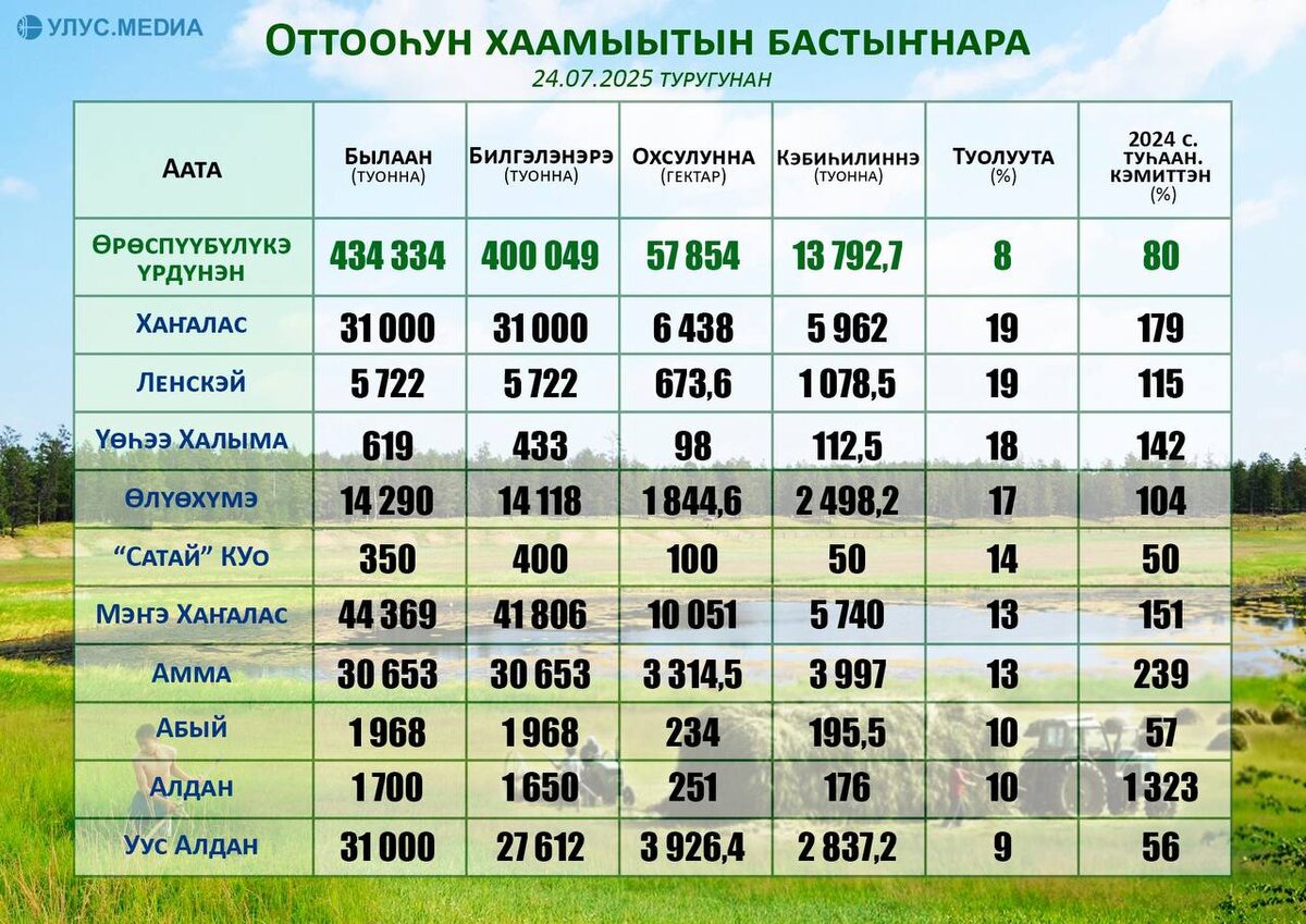 🌿 Оттооһун хаамыыта: тэтимирдэ эрээри, былырыыҥҥыттан бытаан 📊 Нэдиэлэ анараа өттүнээҕи 1 бырыһыаҥҥа холоотоххо, от үлэтэ балачча тэтимирдэ эрээри, былырыын баччаҕа оттоммут кээмэйгэ 20 бырыһыанынан тиийбэт. 🚜🌾 Былааннаммыт кээмэйтэн өрөспүүбүлүкэ орто көрдөрүүтүн (8 бырыһыаны) аһара толорон иһэр 9 улууһу уонна “Сатай” куораттааҕы уокуругу бастыҥнарынан ааҕан, оттооһун хаамыытын билиһиннэрэбит. @ulusmedia @Новости газеты «Хангалас»