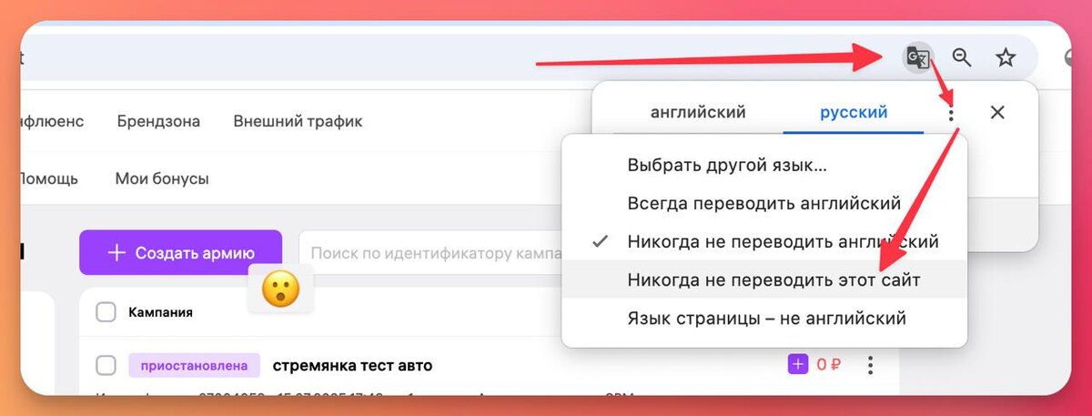 Последние три дня очень много сообщений в поддержку, что за новый функционал «Создать армию»?) Всё дело в автопереводчике: либо ВБ новый кабинет так криво делает мультиязычным, либо Google изменил какие-то параметры автоперевода - не суть важно. При включённом автопереводе появляется много разных артефактов: например, CPC переводится как «КПК», цифры в таблицах начинают дублироваться, а кнопки получают странные названия. В общем, если у вас включен автопереводчик, самый простой вариант - отключить автоперевод для рекламного кабинета ВБ и не париться. Инструкция на скриншоте - всего 3 клика