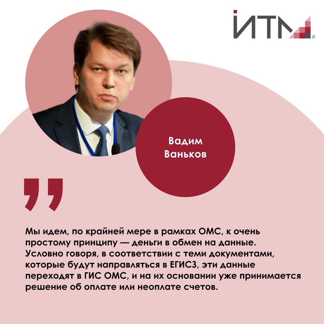 «Мы идем, по крайней мере в рамках ОМС, к очень простому принципу — деньги в обмен на данные. Условно говоря, в соответствии с теми документами, которые будут направляться в ЕГИСЗ, эти данные переходят в ГИС ОМС, и на их основании уже принимается решение об оплате или неоплате счетов», — пояснил заместитель министра здравоохранения Вадим Ваньков.