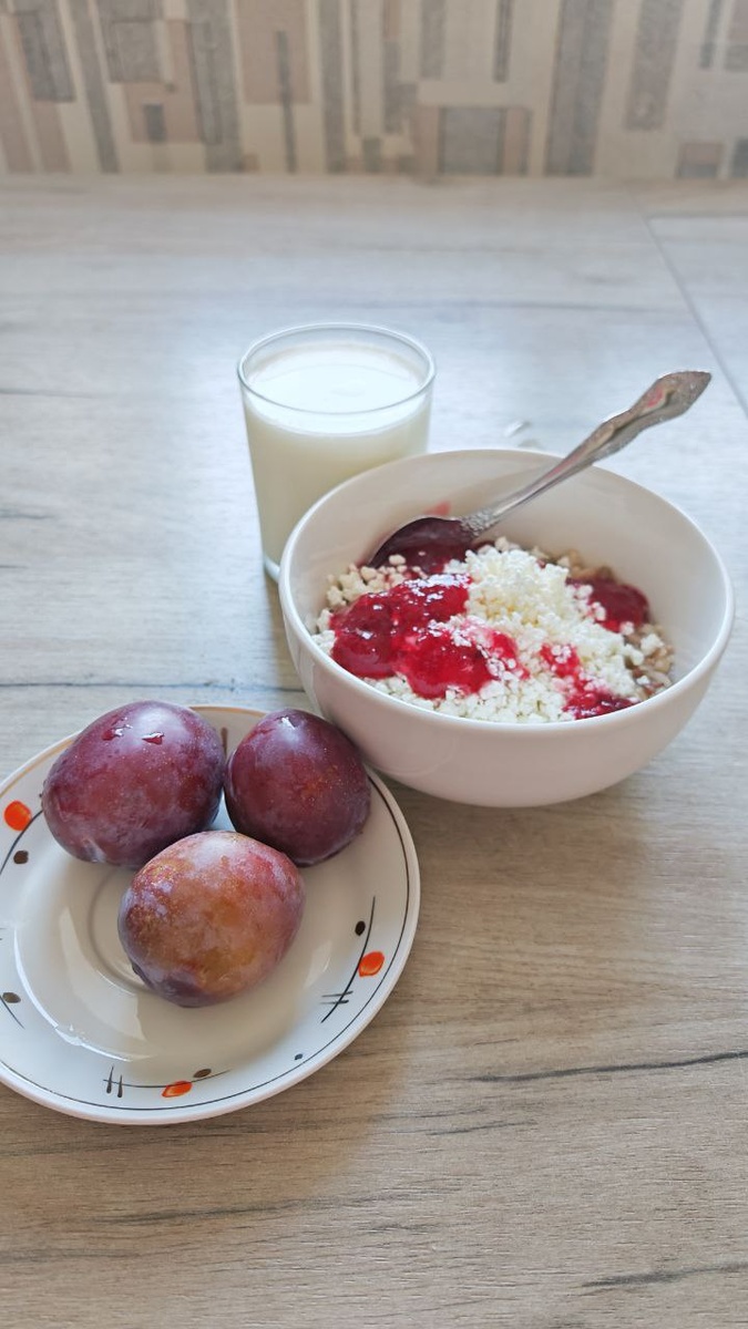 Мой завтрак!!! Каша - из хлопьев 5 злаков цельнозерновых (4 ст л), смесь семян 1 ст л, творог 5% жирности 3 ст л, варенье из красной смородины 2 ст л, соль немного. Хлопья и семечки залила кипятком до занятия йогой, они хорошо распарились. Семечки и орехи содержат фитины, которые снижают всасывание железа в кишечнике и кипяток разрушает эти белки. Этот лайфхак полезен тем, у кого понижен гемоглобин и ферритин! Сливы домашние😊 Йогурт домашний😊 - рецепт выкладывала несколькими днями ранее (из молока и из орехов) - листайте ленту выше или переходите по хэштэгу:👇 #рецептправильноепитание Приятного аппетита!!! #мойзавтракпослейоги