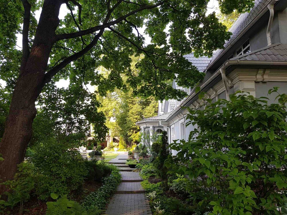 Хозяйка бережно сохранила вековые деревья, имеющиеся на участке. Она говорит: "Я добавила какие-то акценты, которые показались мне уместными, а сад, какой он был при том времени, когда я въехала, таким и остался. Я просто поддерживаю его, как хранительница исторического места".