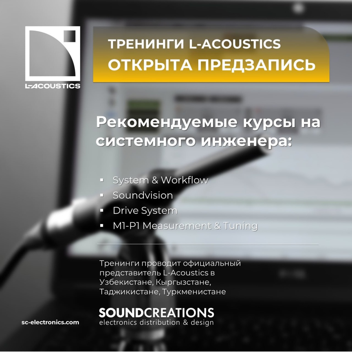 Хотите стать сертифицированным системным инженером L-Acoustics? Звук мирового уровня начинается с правильного обучения. Мы открыли предзапись на курсы, которые помогут вам не просто освоить профессию, а выйти на уровень эксперта, работающего по международным стандартам звукового дизайна. ✅ System & Workflow — Базовый курс, который знакомит с L-Acoustics и общей структурой тренингов. ✅ Soundvision - изучите фирменное ПО для 3D-моделирования пространств и точного проектирования акустических систем. ✅ Drive system - курс о работе с аппаратными и программными компонентами, обеспечивающих передачу и обработку аудиосигнала от выхода микшерного пульта до входа акустических систем, включая аудиосеть AVB-MILAN. ✅ M1-P1 Measurement & Tuning - вы узнаете, как делать измерения с помощью процессора P1 и выполнять точную настройку системы звукоусиления с помощью ПО M1, добиваясь идеального звучания. Тренинги будут проходить в Ташкенте, Бишкеке и Тбилиси с августа по декабрь 2025. Точное расп