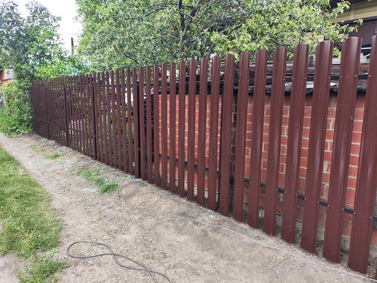 Особое внимание стоит уделить заборам из профилированного листа. Опытные мастера рекомендуют устанавливать опоры с шагом 2,5 метра. При шаге в 3 метра нет гарантии, что конструкция не деформируется под действием ветровой нагрузки. Исключение — если высота листа не превышает 1,5 метра. В остальных случаях — расчёт пролёта = 2,5 м, а заглубление столбов — 1,2 м.
