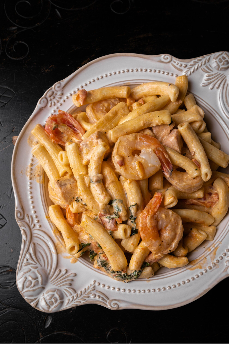 - Пасту отвариваем до состояния аль-Денте. Добавляем к креветкам, солим и добавляем лосось 50гр. Обжариваем все вместе ~3-4мин