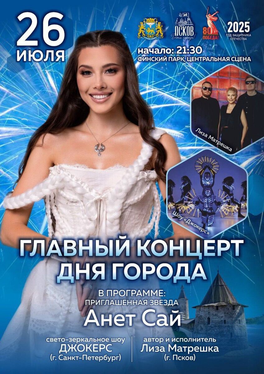 Главной звездой праздничного концерта на Дне города в этом году станет известная российская исполнительница Анет Сай. Она выступит на центральной сцене в Финском парке вечером 26 июля. По словам главы Пскова Бориса Елкина, решение пригласить именно эту артистку связано с ее популярностью у молодежи. Об этом он рассказал в прямом эфире радиостанции "Маяк-Псков".