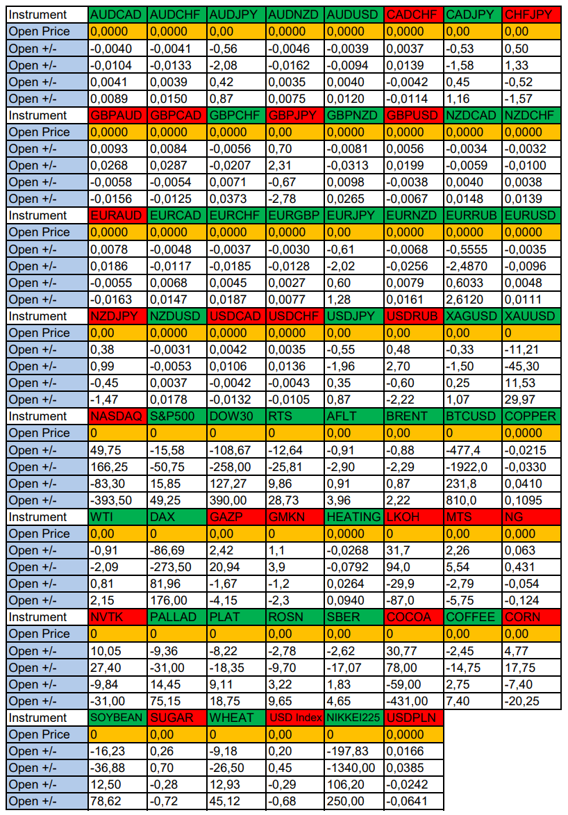 Весь перечень анализируемых активов указан ниже в общем количестве 62 инструмента. Здесь Вы найдете активы рынка Форекс, популярные активы Московской биржи, не менее популярные активы Чикагской биржи СМЕ и мажор криптовалютного сегмента - Биткоин, за которым следуют все альткоины.