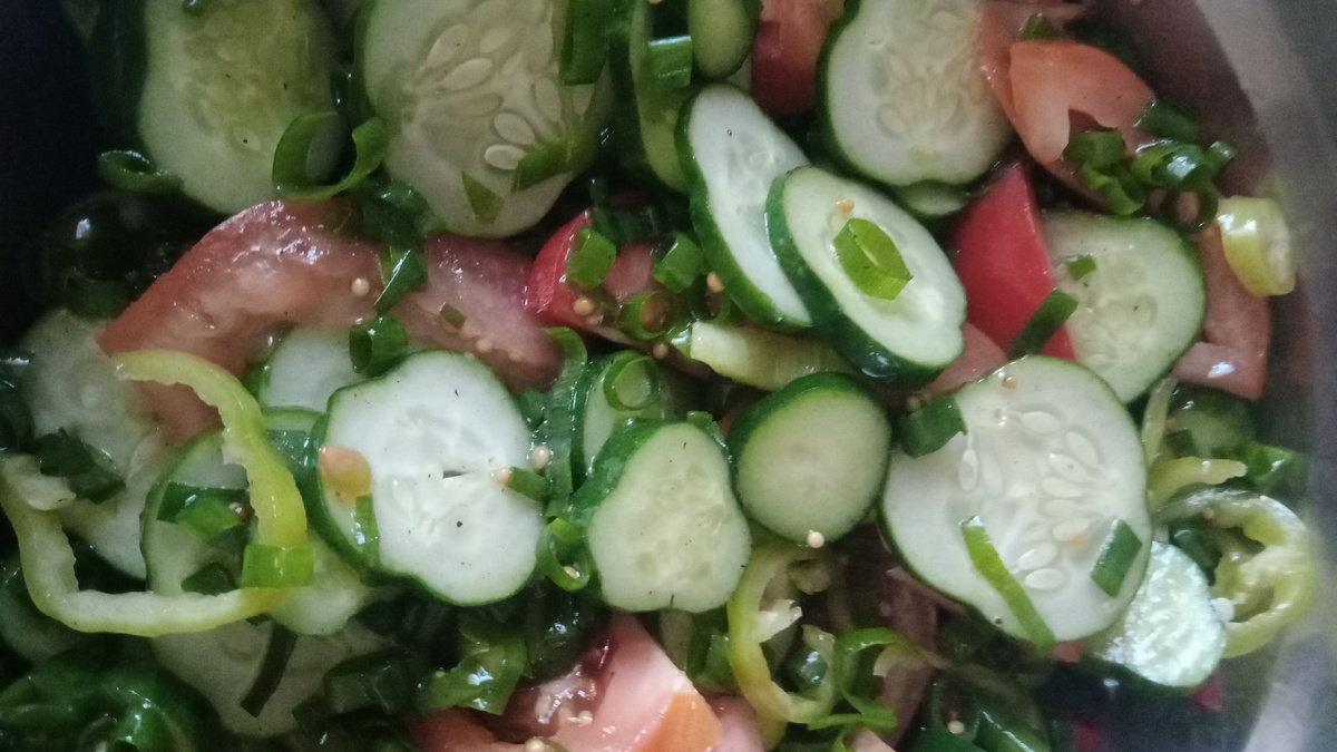 Дорогие друзья, давайте приготовим вкусный и сочный летний салат. Ингредиенты: Огурцы Помидоры Перец сладкий Лук зеленый Для заправки: Соевый соус-1ч.л Тяжинская горчица-1ч.л Масло, перец-по вкусу Соль и уксус по желанию Помыть овощи и удалить плодоножки и семена из перца Нарезать удобным вам способом Готовим соус Заправить салат и добавить соль и уксус по вкусу. Поставить в холодильник пропитаться. Приятного аппетита!!! Ставьте лайки и подписывайтесь на канал!