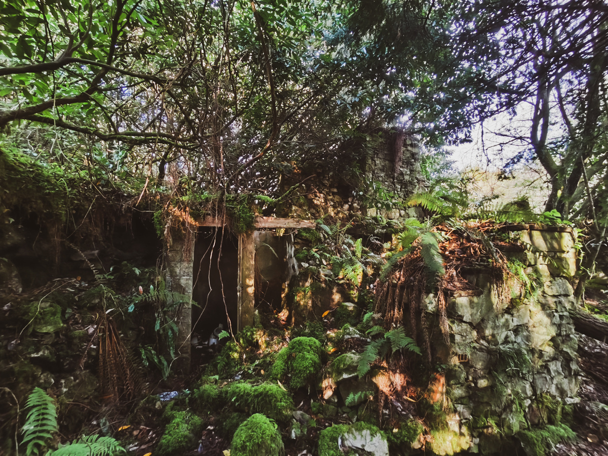 11.04.2025. Проснулся я позже всех и уходил последним, когда уже мыл посуду после завтрака, почему-то зашли полицейские и спросили один ли я в здании, сказал им Uno и они ушли, что это было, так и не понял. Так как персонала не было, то я просто закрыл дверь заранее полученным ключом и положил его в коробочку на стене. Все бары были закрыты, испить кофе не удалось, ну и ладно. Утром почему-то не было тумана. Пройдя всего чуть-чуть сразу попал в лес, потом указатель сообщил что если свернуть с тропы, то через 200 метров будет водопад, решил свернуть. Водопад небольшой, но в лучах утреннего солнца, пробивающихся сквозь листву смотрится неплохо. Дождя вроде не было, но в лесу было как-то мокро, к обеду прошло, наверное, роса. Пересекая шоссе заметил полуразрушенное здание, почти полностью покрывшееся растительностью и мхом, зашёл, всё осмотрел и изучил, люблю зелёные развалины.