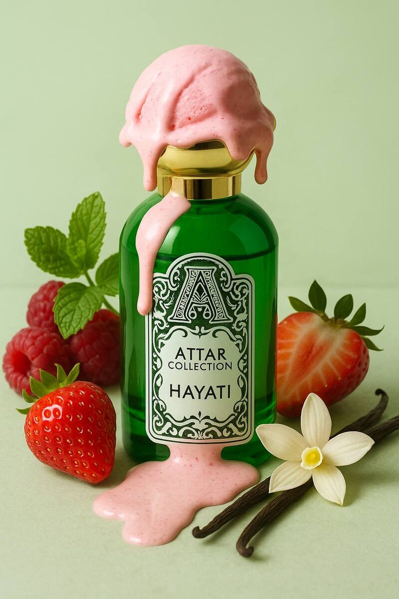 🍨Attar Collection Hayati — аромат, который хочется съесть. Взрыв сладости с первых нот: спелая клубника, ванильное мороженое и сахарная вата окутывают, как любимый десерт из детства. Потом раскрывается мягкая сливочность, будто тающий шарик пломбира, и лёгкая кислинка, как йогуртовая нота. Это не просто гурманика — это настоящая ароматная нега, которая вызывает улыбку и аппетит. Для кого: для тех, кто хочет пахнуть вкусно, вызывающе и запоминающе. Впечатление: будто вы — воплощение ванильно-клубничного удовольствия.
