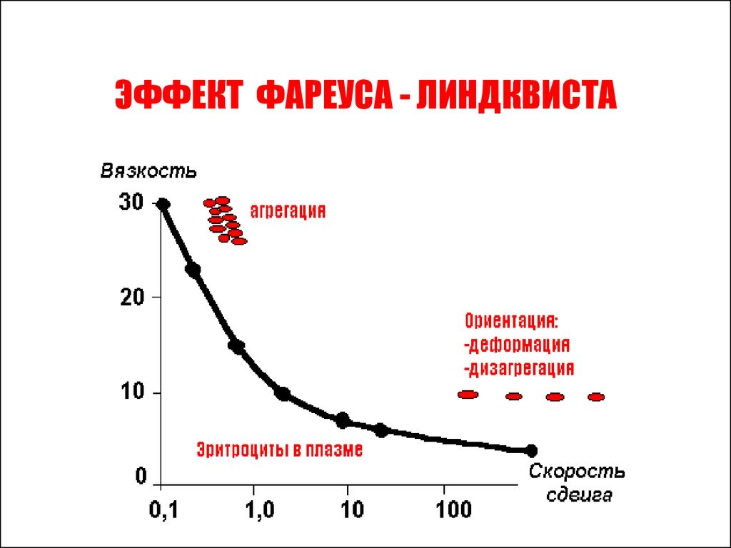 В статье НЕНЬЮТОНОВСКАЯ ЖИДКОСТЬ я упоминал, что к таковым относится и кровь тоже, ибо вязкость и текучесть этой ткани зависит не от её природы, а от степени воздействия физической силы. Но тут есть один весьма интересный момент... Дело в том, что вот прямо сейчас, в этот самый момент, в организме каждого из вас (и даже моём собственном) наблюдается ЭФФЕКТ ФАРЕУСА - ЛИНДКВИСТА, который сводится к тому, что вязкость нашей крови уменьшается в зависимости от диаметра сосуда, по которому движется. Повторяю, изменяется не скорость и не давление, а именно вязкость. Правда, происходит это только при диаметре 10–300 микрометров, то есть эффект связан с движением крови по капиллярам. И, возможно, как раз этим он и объясняется. Просто в этом случае диаметр сосуда немногим больше диаметра эритроцита - красного кровяного тельца, основного форменного элемента крови. Поэтому когда жидкость движется по столь узким каналам, происходит переориентация входящих в неё клеток, и в центре капилляра эритр