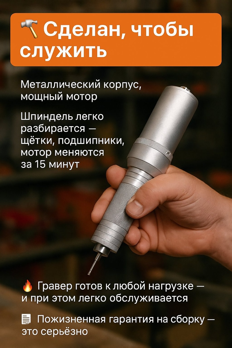 Инструмент с ресурсом Обычный гравёр сгорел — и его проще выкинуть. Ремонт? Пластик неразборный, мотор не найти. Вы теряете не только деньги, но и время. Tornadotool — это металлический корпус, шпиндель с доступом к щёткам, мотор — съёмный и обслуживаемый. 🔁 Любую деталь можно заменить. Инструмент работает годами. Серьёзно. Пожизненная гарантия на сборку. #tornadotool #инструментдлямастера #ремонтинструмента #надежность #российскоепроизводство