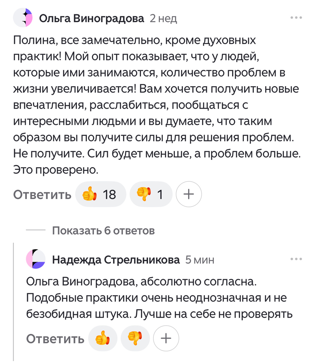 Поэтому мой опыт мне говорит, что духовные практики приносят пользу. Но все же было бы интересно понять, что имеют ввиду те люди, которые высказываются против.