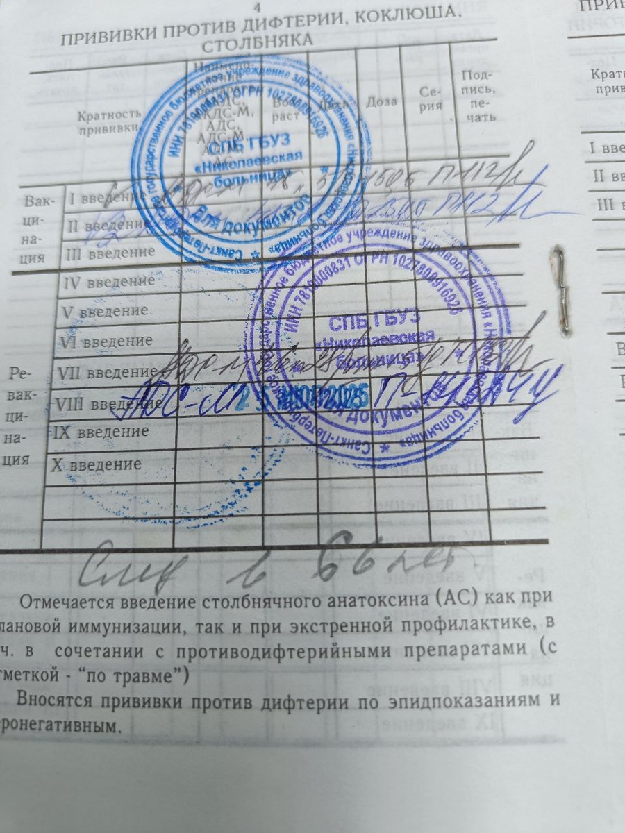 Прививка АДСМ - столбняк и дифтерия, входит в обязательные из Национального календаря прививок России