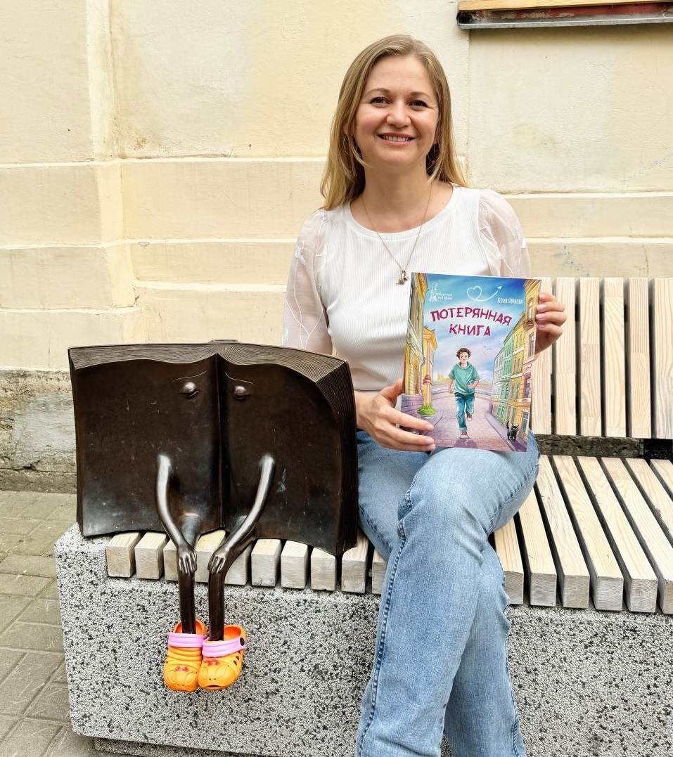 Больше других меня поразил памятник грустной книжке, которая сидит на скамейке и печалится, так как её кто-то забыл. На маленьких ножках трогательно смотрелись оранжевые детские кроксы. Я села рядом, прикоснулась к бронзовой макушке и подумала: «Как было бы здорово написать про эту книжку историю», и всё закрутилось.