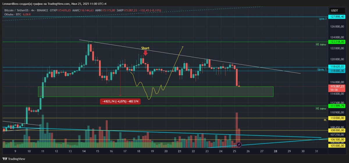 В ответ на пост #BTC 🕯Локально🕯 Доброе утро, коллеги! Вчера снова был в передвижениях и как вижу, ничего существенного не пропустил, скорее наоборот: дождался ожидаемого!! ⚠️Итак, предыдущее подозрение на ложный пробой трендовой себя полностью оправдало и если вы корректируете свои графики после тех или иных событий, то с легкостью увидите, как цена четко отрегалировала на обновленную трендовую!! ⚠️Что дальше?? Ночная сопля на 4Н ТФ выглядит впечетляюще = ликвидаций на 700млн$!, и да, пока направление на продолжение снижения, как минимум на закрытие дыры. Ключевой уровень поддержки я вижу 112К, тот самый прежний майский HI, ну либо один из них, как кому удобно. Ниже есть зона уровня 108К, вы также его помните, это верхняя граница среднесрочного блока (была ранее). Но, пока цена выше 112К = ниже не рассматриваю!! P.s. друзья, среднесрочно всё достаточно красиво и прогнозируему. По факту имеем тот самый 2х недельный боковик, о котором говорил при выходе в зону уровня 120К. Структур