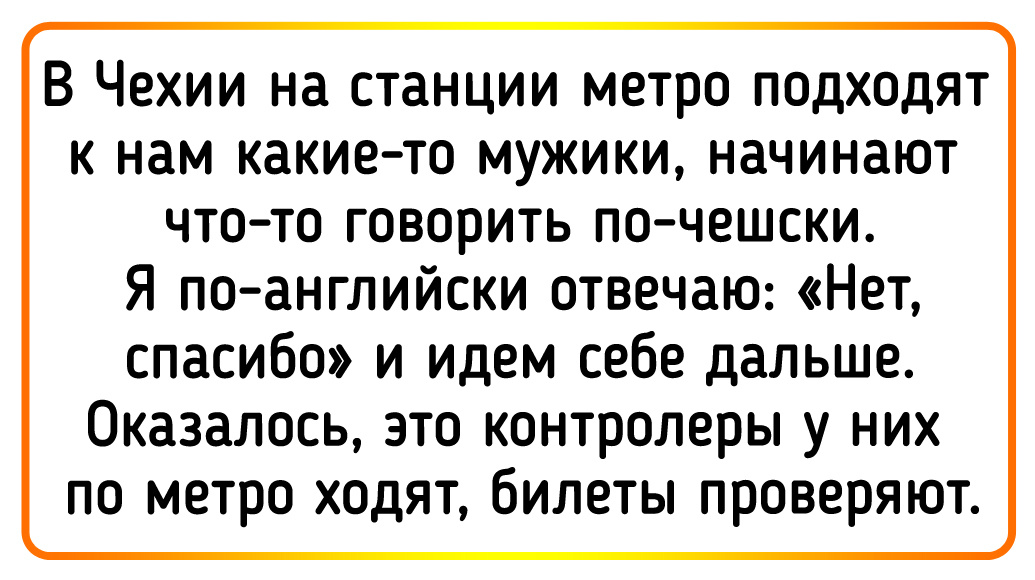 В Чехии на станции метро подходят к нам какие-то мужики, начинают что-то говорить по-чешски. Я по-английски отвечаю: «Нет, спасибо» и идем себе дальше. Оказалось, это контролеры у них по метро ходят, билеты проверяют. © LegalizeRanch / Pikabu