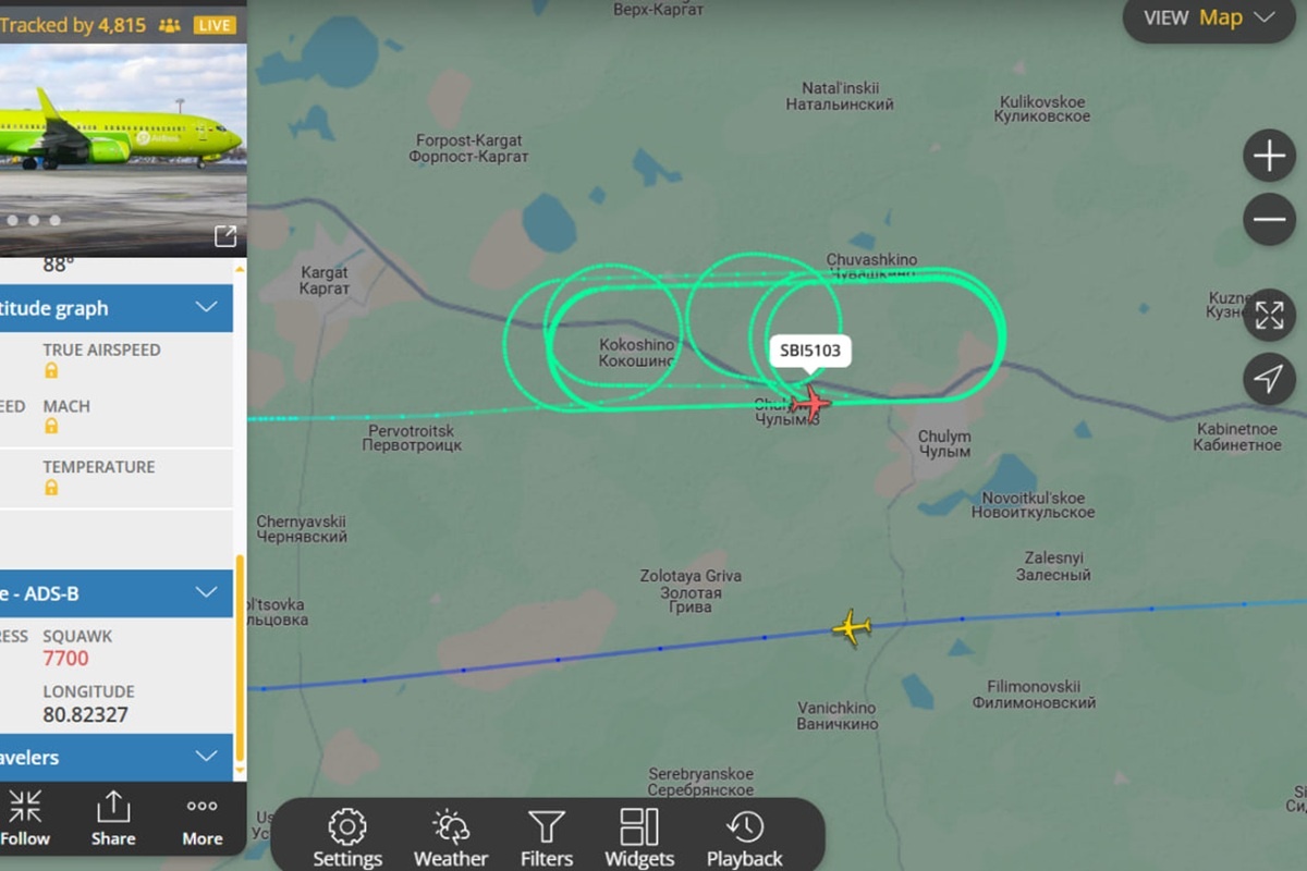 Воздушное судно S7, 25 июля вылетевшее рейсом из международного аэропорта Толмачево в направлении Сочи, кружит над населенным пунктом Чулым. Экипаж отправил специальный аварийный сигнал «7700», означающий возникновение опасной ситуации на борту.