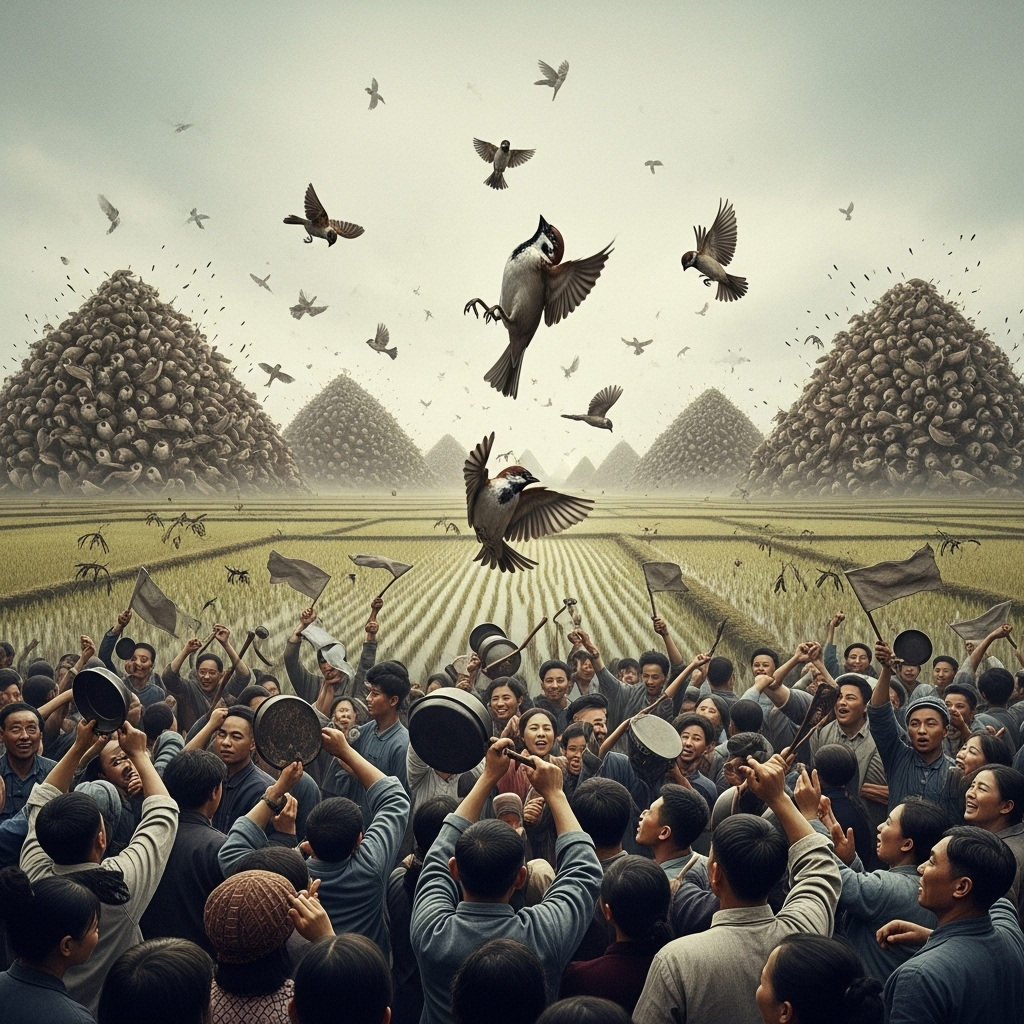 В программе "Большой скачок" среди нескольких неотложных задач для китайского народа он назвал двух главных врагов Китая. Один из них, понятно, США, а второй — нет, не СССР, с которым Мао тогда уже успел разругаться. Второй главный враг китайского народа — воробьи. Враг страшный. Выступивший с доказательствами китайский академик-биолог призвал к уничтожению популяций мух, комаров, крыс и воробьёв.