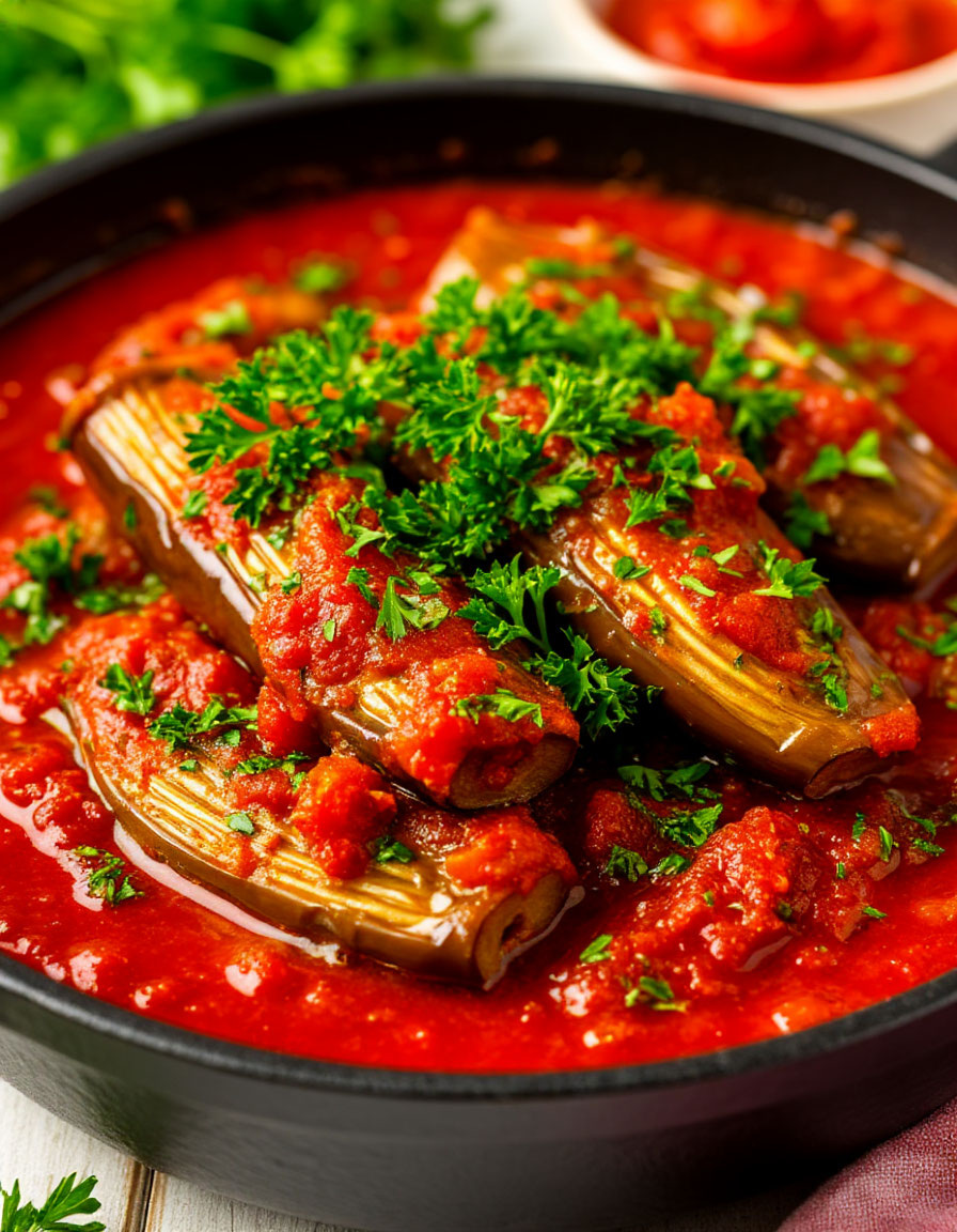 Баклажаны по-кавказски — это традиционное блюдо, популярное в Кавказском регионе, которое славится своим насыщенным вкусом, пряными специями и аппетитной текстурой. Готовится оно легко и быстро, а результат порадует любителей острого и ароматного. Подготовка баклажанов: Вымойте баклажаны и нарежьте их кружочками толщиной около 1 см. Посолите их и оставьте на 15–20 минут, чтобы ушла горечь. После этого промойте холодной водой и обсушите бумажным полотенцем. Обжарьте баклажаны на разогретой с маслом с обеих сторон до золотистого цвета или запеките в духовке при 200°C около 20 минут. Приготовление соуса: Мелко нарежьте лук и обжарьте его на растительном масле до прозрачности. Добавьте измельченный чеснок, жарьте еще минуту. Введите нарезанные помидоры или томатную пасту, специи (красный перец, зиру, кориандр), посолите по вкусу. Тушите соус на среднем огне около 10 минут до загустения. Собираем блюдо: Выложите обжаренные или запеченные баклажаны в глубокую сковороду или форму для запекани