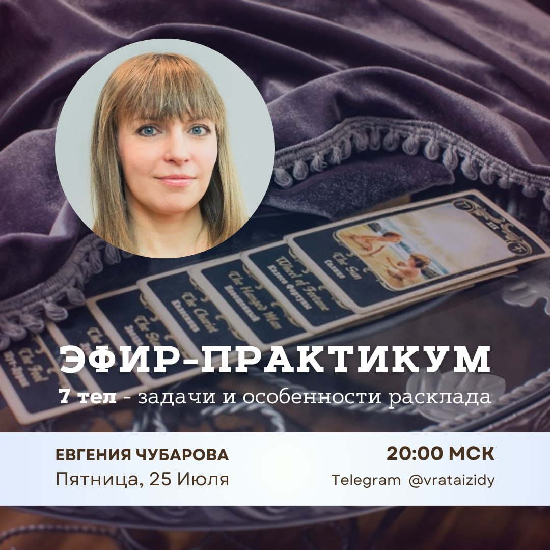 🃏 Расклад «Семь тел» — это один из эзотерический раскладов, которые осваивают на курсе «Мастер Луча». Именно с его помощью определяют Лучи миссии. Но также он даёт понимание о том, в каких энергиях пребывает человек в этот период жизни, помогает сориентироваться в процессах и задачах на внутреннем плане. Конечно, каждый мастер Луча стремится усовершенствовать чтение этого расклада. И сегодня у вас есть такая возможность. ⚡️В Telegram-канале Школы «Врата Изиды» сегодня в 20:00 преподаватель курса «Мастер Луча» Евгения Чубарова проведёт эфир-практикум по раскладу «Семь тел». 🔘Какие особенности есть у расклада «Семь тел»? 🔘Какую важную информацию можно почерпнуть из него? 🔘Каким клиентам этот расклад будет полезен? ❤️ А также в рамках практикума Евгения сделает расклад «Семь тел» двум участникам эфира! Ловите возможность получить ценные знания от опытного преподавателя! Приходите на эфир сегодня в 20:00 в Telegram-канал Школы «Врата Изиды». ✨ Запись эфира будет выложена в груп