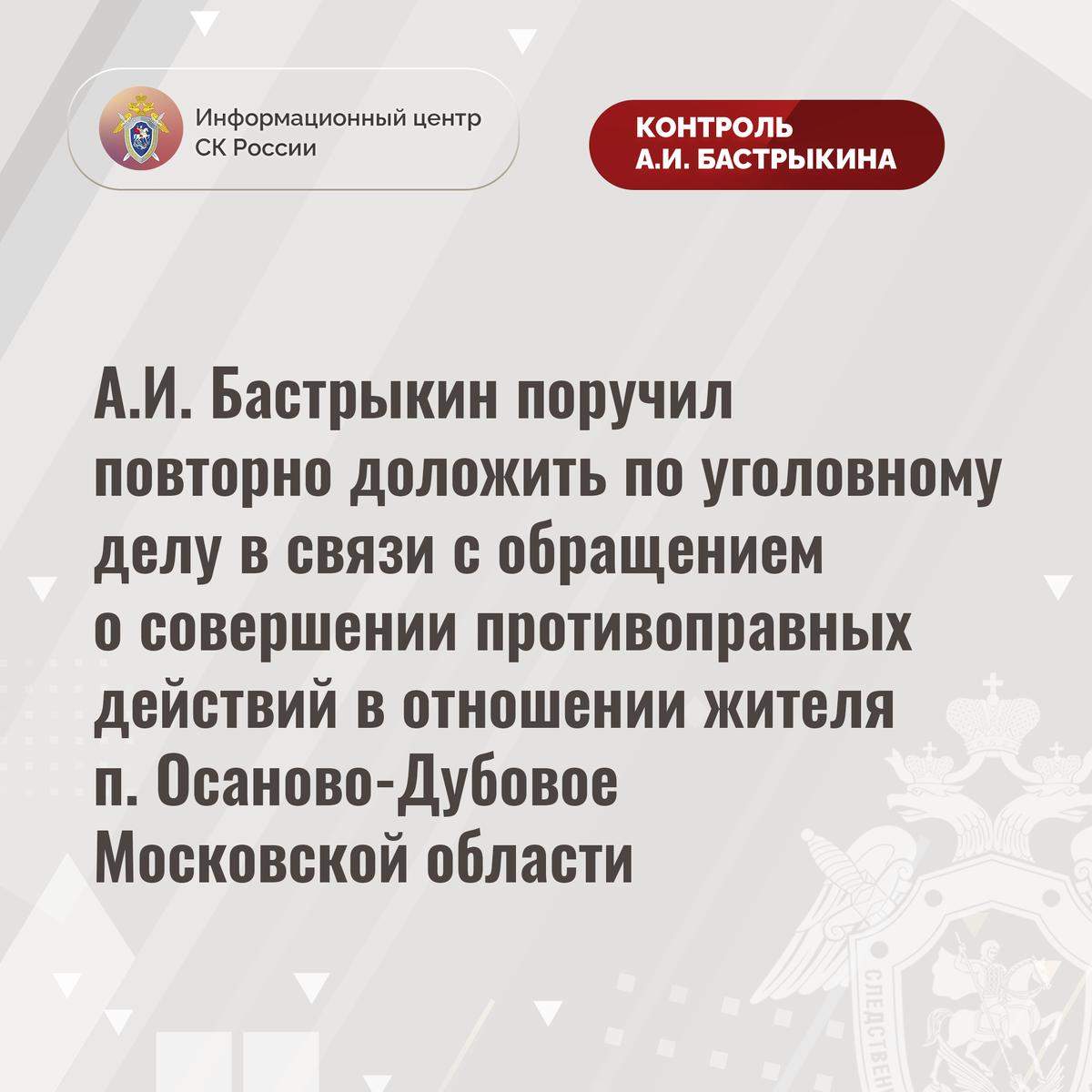А.И. Бастрыкин поручил повторно доложить по уголовному делу в связи с обращением о совершении противоправных действий