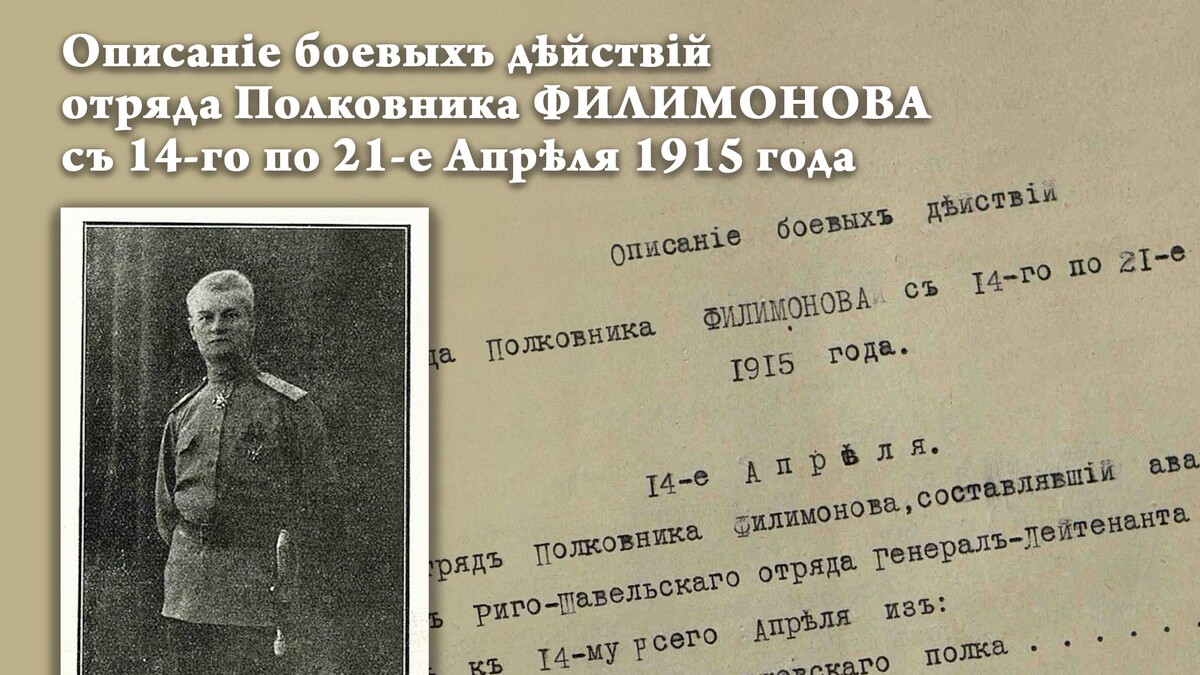 Когда 14-21 апреля 1915 года отряд полковника Бориса Петровича Филимонова пробился с боями от Тильзита до Митавы, он сообщил об этом своему командиру генерал-лейтенанту Александру Николаевичу Апухтин. Обожаю первоисточники, а потому привожу скан документа, хранящегося в Российском государственном военно-историческом архиве (фонд 2398, опись 2, дело 141). Исправил только мелкие очевидные опечатки.