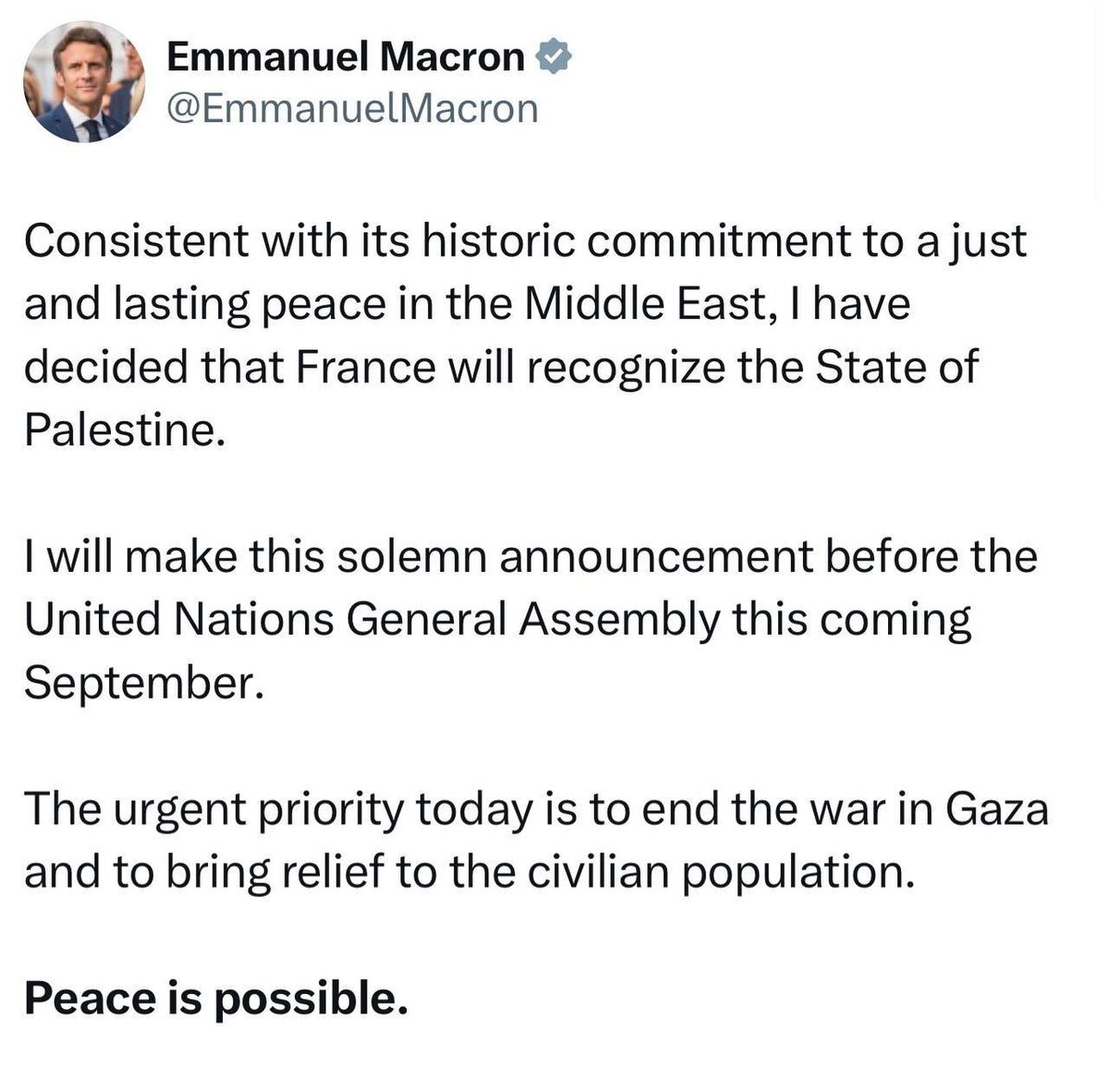 ⚠️ Макрон - заявил, что Франция официально признает Палестину в сентябре 2025