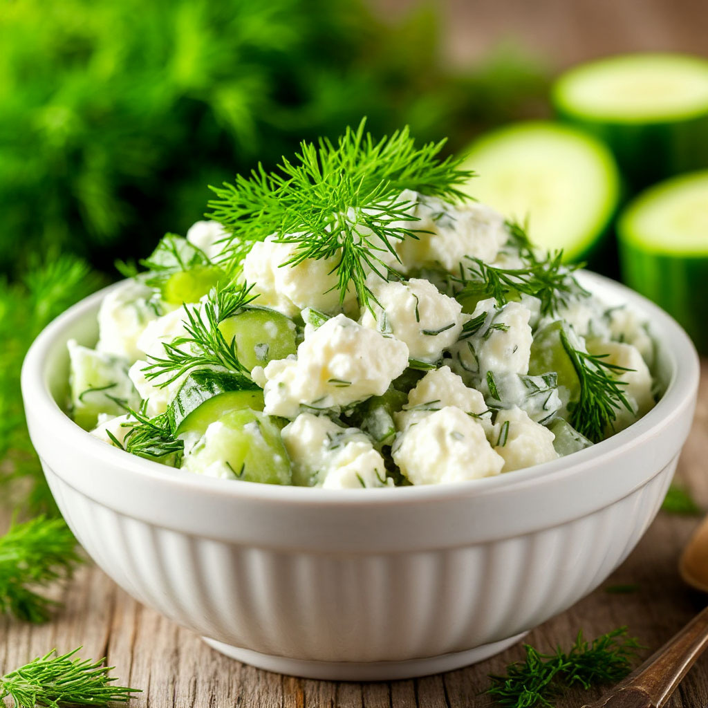 В современном мире забота о здоровье и правильном питании становится все более актуальной. Одним из простых и вкусных способов пополнить рацион белками и витаминами является творожный салат с укропом. Этот легкий, свежий и ароматный салат отлично подходит для завтрака, перекуса или легкого ужина, а его приготовление занимает всего несколько минут. Почему стоит выбрать именно этот салат? Творог — это источник полноценного белка, кальция и витаминов группы В. Он способствует укреплению костей, улучшает работу кишечника и помогает поддерживать чувство сытости на долгое время. Укроп добавляет свежести, обладает антибактериальными свойствами и богат витаминами C и A. Комбинация этих ингредиентов делает салат не только вкусным, но и очень полезным для организма. Ингредиенты подготовлены? Тогда приступим! Подготовка огурца: Вымойте огурец под проточной водой. Нарежьте его мелкими кубиками или тонкими полукольцами — по вашему предпочтению. Порубите укроп: Промойте укроп, обсушите бумажным поло