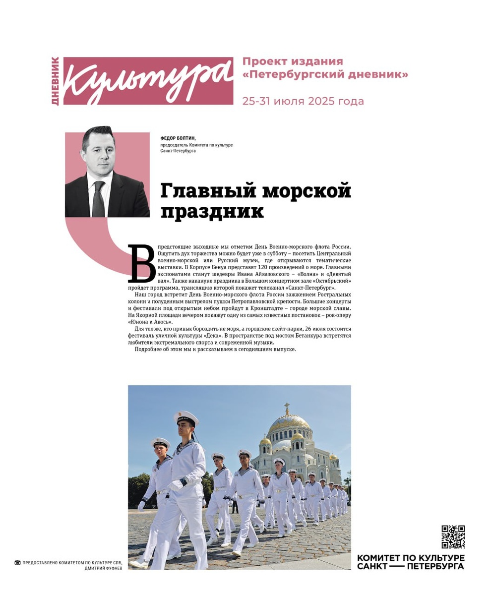 📰 А вы уже прочитали Культурную вкладку «Петербургского дневника»? Председатель Комитета по культуре Санкт-Петербурга Федор Болтин — о том, как Петербург и Кронштадт готовятся отметить День ВМФ. Подробности — в пятничном выпуске нашей газеты. Петербургский дневник