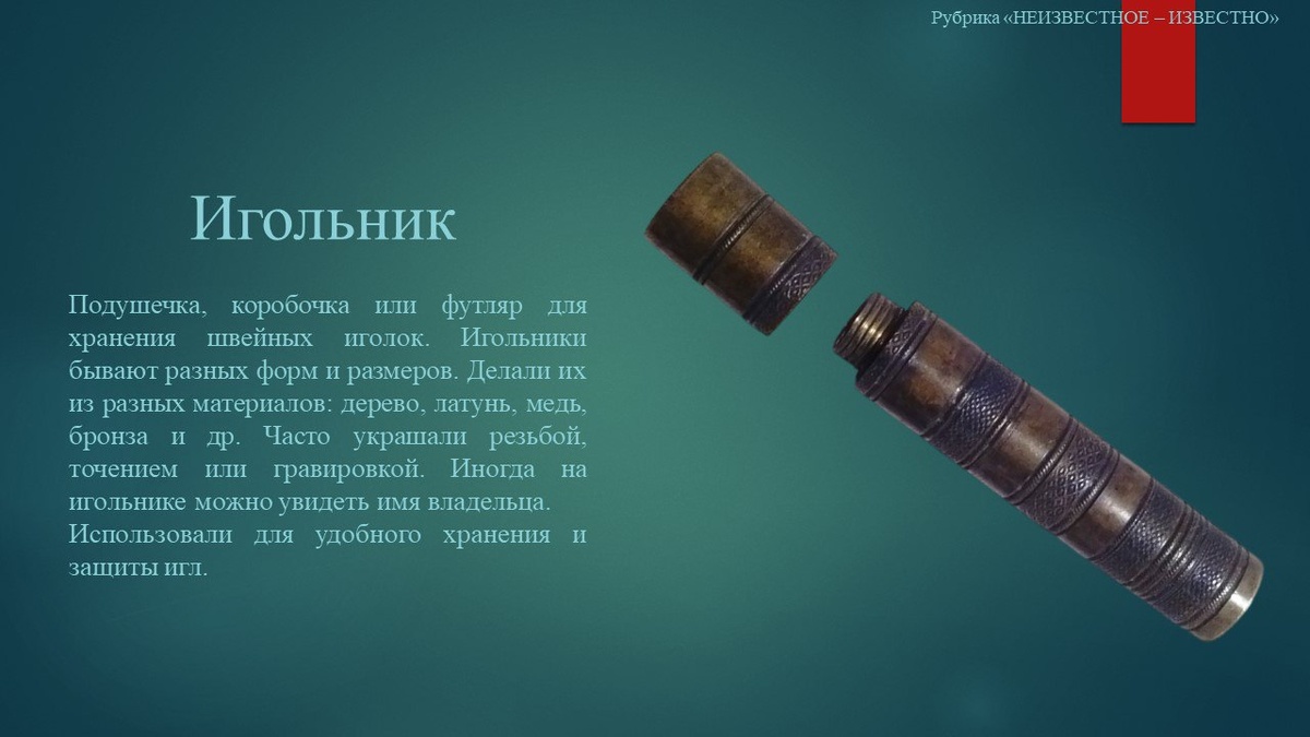 Добрый день, дорогие друзья! Рубрика "НЕИЗВЕСТНОЕ – ИЗВЕСТНО". Игольник – новое слово в нашей еженедельной рубрике. На слайде фото бронзового игольника ХIХвека. Игольник бронзовый литой, цилиндрической формы, с отвинчивающейся крышкой. Поверхность покрыта накатным орнаментом в виде рельефных поясков сромбовидным и точечным орнаментом, узкими каймами. Дно игольника слегка выпуклое, на верхней части крышки углубление и средний округлый выступ. Предметприобретен 13 июля 1907 г. у жителя нашего города. Участвовал в нескольких выставках. #углич #uglich#неизвестноеизвестно #угличскиймузей #игольник #швея #шить