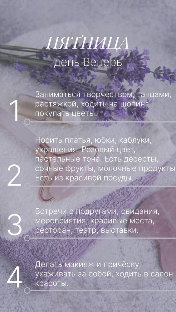 ✨ ПЯТНИЦА — ДЕНЬ ВЕНЕРЫ: КРАСОТЫ, ТВОРЧЕСТВА И ШАРМА Очень давно мы не говорили о планетах и о людях, рожденных под их энергией. Каждый день недели несёт в себе ритм планет — давайте раскроем магию пятницы — день сияющей Венеры! Пятница = День Венеры Этот день наполнен чистой, кристальной энергией, словно утренний свет, играющий на гранях бриллианта. Венера — планета стиля, изящества, творчества и любви. Она учит нас: ⚪Наводить лоск в мыслях и внешности ⚪Раскрывать творческий потенциал ⚪Совершенствоваться через красоту ⚪Окружать себя гармонией Идеальный день для: ✅Творческих проектов ✅Ухода за собой ✅Обновления пространства вокруг ✅Развития любви к себе 💬 ХАРАКТЕР РОЖДЕННЫХ В ПЯТНИЦУ (а также 6, 15, 24 числа) Если вы появились на свет в пятницу— в вас есть искра Венеры! Это: ⚪Врожденное чувство прекрасного — вас тянет к искусству, эстетике, вы цените красоту во всем. ⚪ Природный шарм — люди чувствуют вашу энергию и тянутся к вам. ⚪Любовь к комфорту — Венера не терпит неуд