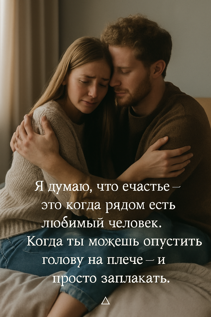 Я думаю, что счастье — это когда рядом есть любимый человек. Просыпаться с ним по утрам. Смотреть в одну сторону. Думать одинаково. Беспокоиться за него. Чувствовать всё так, как будто это часть тебя. Счастье — это когда ты знаешь, что о тебе помнят. Не для галочки. Не по привычке. А потому что ты — ценная часть жизни. Потому что ты — ∴ живой, ∴ нужный. Это когда ты можешь опустить голову на плечо — и просто заплакать. И знать, что тебе не скажут «соберись». А просто будут рядом. Просто поймут. Просто обнимут. И ты тоже сможешь это сделать — для него, для неё, для своего человека. Без страха. Без защиты. Настоящим. Я не знаю, как выглядит счастье у других. Но в моём случае — оно выглядит именно так.