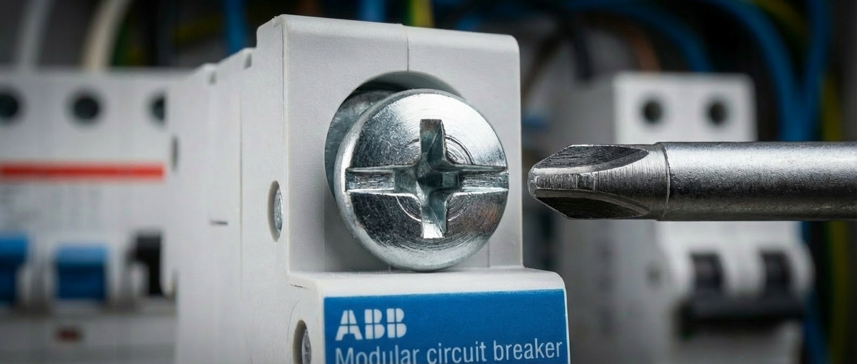 Вы затягиваете клеммы в новом щитке. Шлицевая отвёртка проскальзывает, царапает корпус автомата. Визуально — мелочь. Но если автомат начнёт греться на контакте из-за недотянутой клеммы — это уже аварийная ситуация. Замена автомата — от 800 до 2 500 рублей. Вызов электрика — ещё 2 000–5 000.